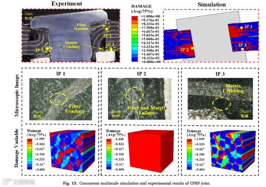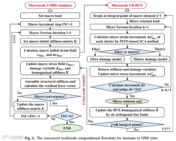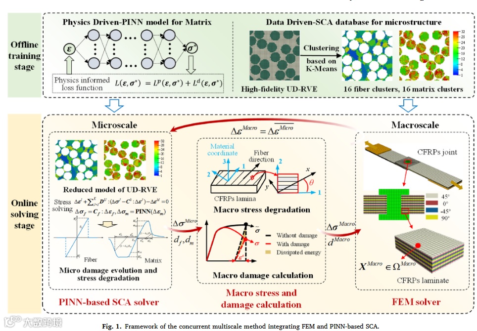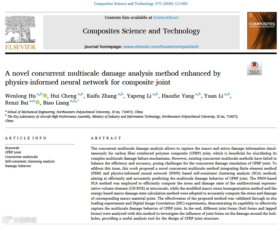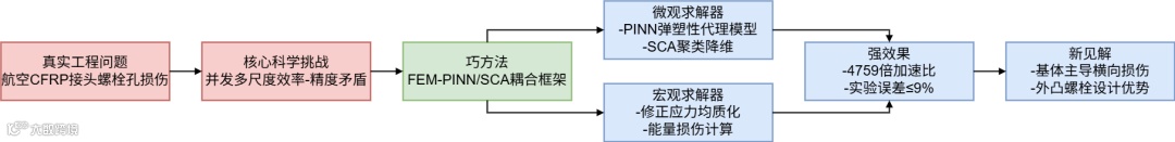 本论文发现了碳纤维增强复合材料(CFRP)接头在真问题——传统并发多尺度损伤分析方法无法平衡效率与准确性。核心硬挑战在于微观尺度单向代表体积元(UD-RVE)的非线性损伤响应计算效率低下。为解决此挑战,作者提出了巧方法——集成有限元法(FEM)与物理信息神经网络(PINN)增强的自洽聚类分析(SCA)的新型并发多尺度框架。该方法展示了强效果:计算速度比传统FEM快4754倍,比传统SCA快9倍,并通过原位实验与数字图像相关(DIC)验证了精度。最终凝练出新见解:基体损伤对横向应力退化的主导作用,以及外凸螺栓-单搭接接头形式在损伤抑制上的设计优势。