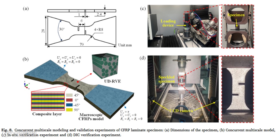 提出融合FEM与PINN-SCA的并发多尺度方法以高效预测CFRP接头损伤。微观层面用PINN-SCA计算UD-RVE应力/损伤状态,宏观层面用修正应力均质化和能量法计算相应变量。通过原位加载和DIC实验验证有效性,并分析不同接头形式(螺栓形式/搭接形式)对螺栓孔损伤的影响。