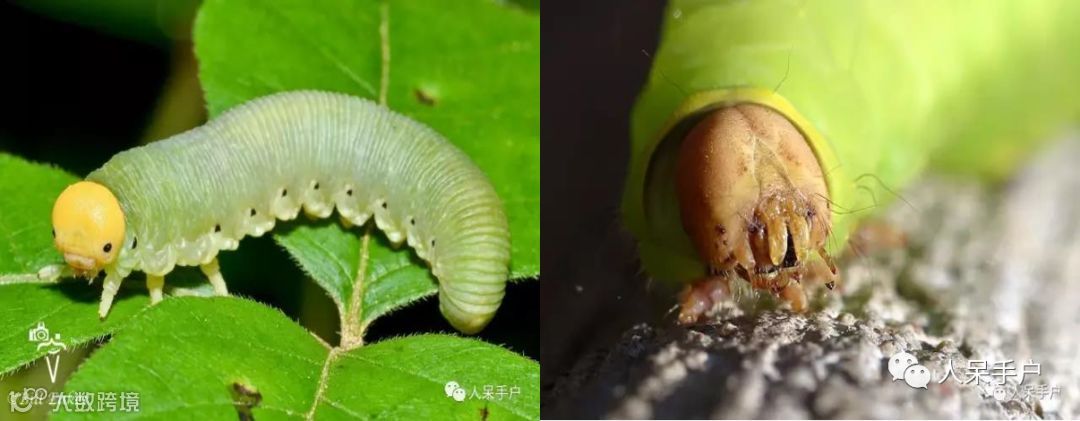 首先“看脸”,叶蜂幼虫通常长着又圆又亮又明显的大脑壳,还附带一对黑黑亮亮的单眼;而毛毛虫的额部通常具有“人”形图案,并且单眼多而小,不易发现。