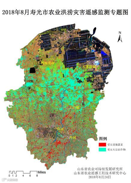 据灾后卫星遥感影像(8月21日)显示,寿光东南部设施蔬菜受灾情况严重,主要集中在弥河以东,丹河以西,上口镇政府以南约500平方公里区域;中东部受灾严重的大宗农作物主要集中在上口镇政府以北,大家洼镇以南、营里镇西浊北村以南约760平方公里区域。目前,遥感监测的具体数据已上报政府有关部门,以期对指导灾后农业恢复生产起到参考作用。