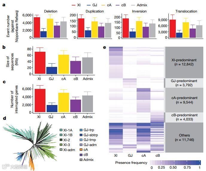 ②发现了亚洲栽培稻中存在大量结构变异,平均每个基因组约有1.2万个结构变异,籼粳亚群间呈现明显的差异,并且可能是引起籼粳杂种不育和杂种衰退的遗传基础。