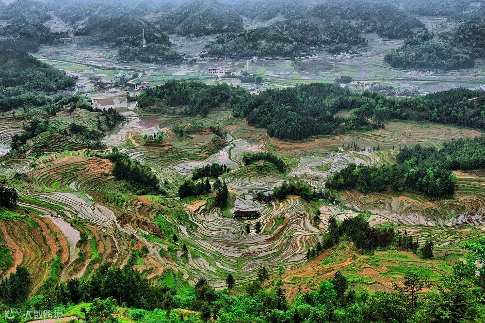 崇义客家梯田坐落在赣南第一高峰齐云山山脉之中,总面积达3万亩。梯田最高海拔1260米,最低280米,垂直落差近千米,最高达62梯层,且大多数为只能种一二行禾的“带子丘”和“青蛙一跳三块田”的碎田块。是“中国三大梯田奇观之‘秀丽天梯’”,被上海大世界基尼斯认证为“最大的客家梯田”。