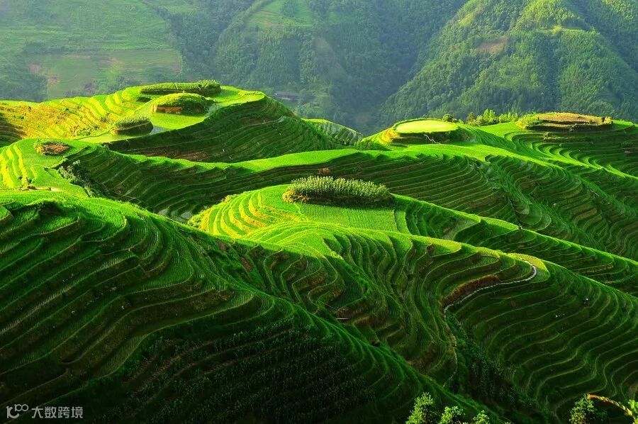 龙胜共有水田223976.85亩,坡度在6°以上约占96%,分布在海拔200至1450米之间的龙胜各个乡镇中。当地100亩以上连片梯田有320处,2000亩以上的连片梯田有9处,其中龙脊片区连片梯田达10734亩。龙胜梯田落差大,层级最多达1100多级,连片梯田最大高差为860多米,有“世界梯田之冠”美称。