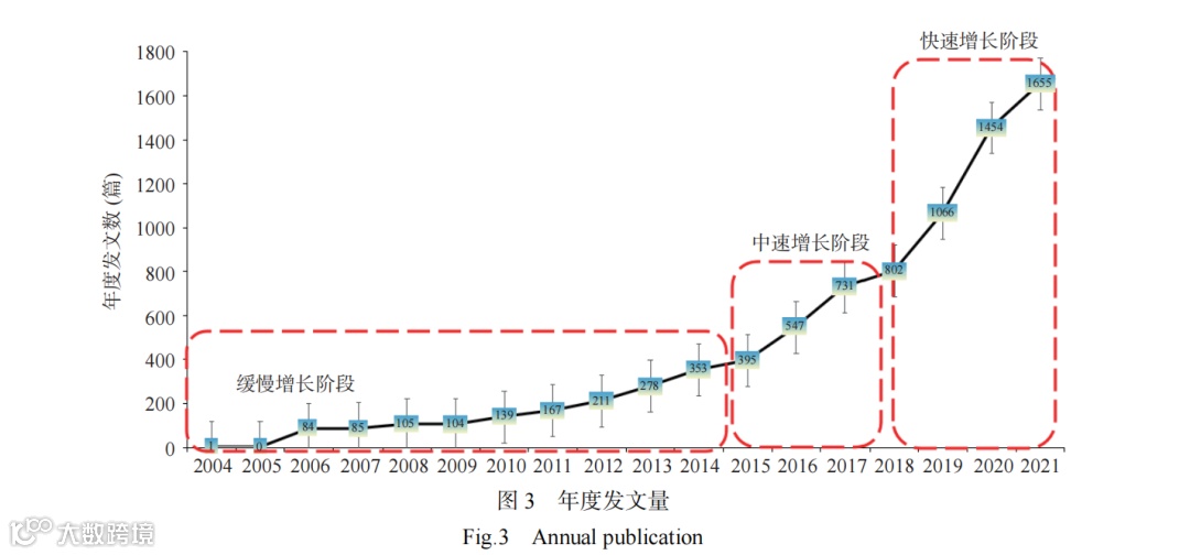 食品与肠道微生物研究领域从2004年至2021年共发表文献8177篇,自2005年起,年度发文量逐年上升(图3)(因本文在2022年2月8日检索文献,故2022年的文献在年度发文趋势上无参考价值),说明此研究领域的关注度一直不断增加,研究体系的构建逐步推进。研究可分为缓慢增长、中速增长和快速增长三个阶段。2004年至2014年为缓慢增长阶段,此阶段发文数量较低且年际差异小;2014年至2018年为中速增长阶段,此阶段年度发文量和增长幅度较上一阶段有较大提升;2018年至2021年为快速增长阶段,此阶段年度发文数量和增幅明显加大,呈快速增长模式,领域研究蓬勃发展。由图3可得,增速转折点为2015年和2018年,可以推断2015年以前和2015~2018年间有经典文献的发表从而推动了整个领域的进展。