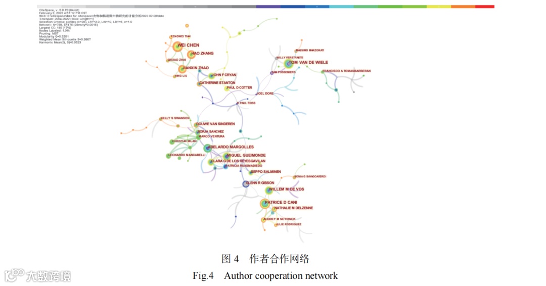 应用CiteSpace对食品和肠道微生物研究领域的作者合作网络进行可视化分析,结果如图4所示。节点表示作者,节点间连线表示各作者之间的合作,节点的大小和作者发文量的多少呈正相关,节点上不同颜色的年轮分别代表在不同年份所发表的文章,年轮厚度和在该年份所发表文章的数量成正比,不同颜色年轮所代表的年份和图谱中最上方相对应,红色为2022年,依次递减;N(节点)=798,即共有798名作者在网络中构成关联节点;D(密度)=0.0015,共线网络密度较低,表明作者间的合作程度较低,此结论由作者的中介中心度最大值仅为0.03也可得出。中介中心度指的是一个节点处在其他两个节点最短路径上的次数,数值处于0~1之间,具备以下两种情况之一的点具有高中介中心度:a.与其他节点具有高度联系;b.联系不同的聚类。根据图谱数据显示,有同一机构作者形成的小范围合作团体,如同在江南大学的WEI CHEN、HAO ZHANG、JIANXIN ZHAO和QIXIAO ZHAI等形成的合作团体,此现象反映作者合作呈现机构内聚性。