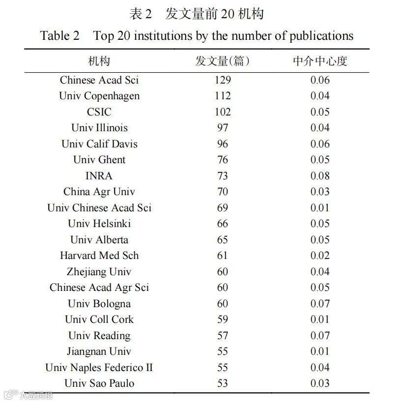 表2为发文量前20的机构。如表所示,发文机构主要集中于高等院校,其中,中国科学院(Chinese Acad Sci)的发文量位居所有机构第一,法国国家农业科学研究院(INRA)的中介中心度最高,和其他机构的联系强度最大。发文量位于第二和第三的分别是哥本哈根大学(Univ Copenhagen)和西班牙国家研究委员会(CSIC)。哥本哈根大学是欧洲顶尖的教育和科研机构之一,健康与医药科学学院是其六大学院之一,其食品专业亦获得了Arla和嘉士伯等国际著名品牌的支持;西班牙国家研究委员会是西班牙最大、欧洲第三大公共研究机构,食品科学与工程是其8个优先发展的领域之一。其中,有6所中国机构入围发文量前20的机构,依次为中国科学院、中国农业大学、中国科学院大学、浙江大学、中国农业科学院和江南大学。