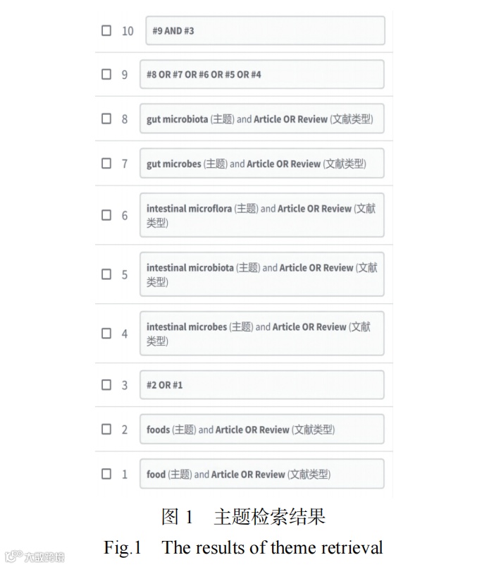 本文数据来源于WOS核心数据库,参考陈超美教授在Science Mapping: A Systematic Review of the Literature中的检索方法,即由多个主题词检索结果组合而成(图1),以便检索到更为全面的文献。首先,检索主题为food和foods,文献类型为Article或Review的文献为#1和#2,主题为intestinal microbes、intestinal microbiota、intestinal microflora、gut microbes和gut microbiota,文献类型为Article或Review的文献为#4~#8;其次,分别对#1~#2和#4~#8的文献进行除重,得到#3和#9;最后,检索包含#3(食品)和#9(肠道微生物)的文献为#10。经CiteSpace除重后共得到从2004年到2022年的8310篇文献。检索时间为2022年2月8日,访问机构为江苏科技大学。