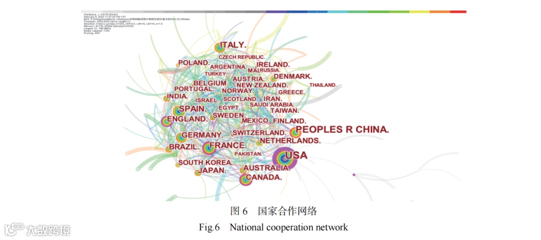 发文量前20的国家(表3)依次是美国、中国、意大利、西班牙、法国、英国、德国、加拿大、澳大利亚、荷兰、日本、巴西、印度、比利时、韩国、瑞典、波兰、丹麦、瑞士和爱尔兰,其中美国和欧洲国家具有显著地位,我国发文量占据第二位,相当于排名第3~5名的意大利、西班牙、法国发文量之和,在该研究领域有较为突出的贡献,虽然我国发文量较多,但是对此领域的研究开始较晚,在2012年的年发文量才超过10篇,而美国早在2006年时年发文量就超过10篇。中介中心度大于等于0.1的国家分别是美国(0.56)、英国(0.17)、德国(0.14)、法国(0.14)、丹麦(0.12)、瑞士(0.11)和加拿大(0.1),均为欧美国家,表明这些国家在此领域具有广泛的国际合作,而中国的中介中心度仅为0.04,处于国际合作网络外围,需加强与其他国家的相关合作。