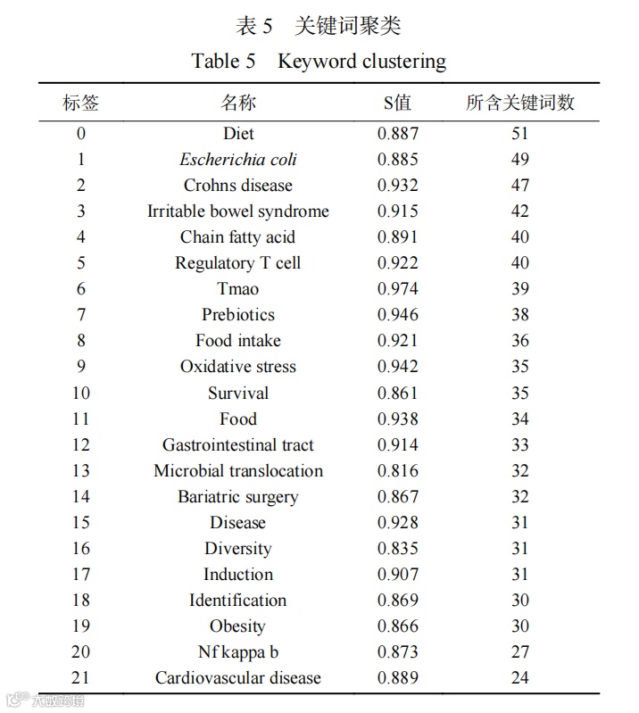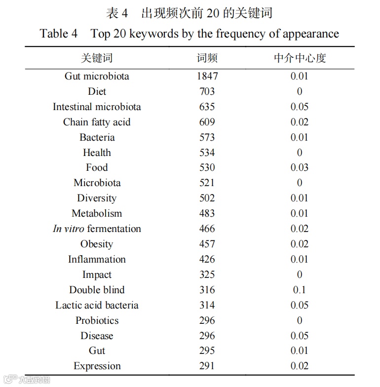 将出现次数前20的关键词列于表4中,分别为肠道菌群(Gut microbiota)、饮食、肠道菌群(Intestinal microbiota)、碳链脂肪酸、细菌、健康、食品、菌群、多样性、新陈代谢、体外发酵、肥胖、炎症、影响、双盲法、乳酸菌、益生菌、疾病、肠道和表达。其中,第1、第3和第8关键词可合并为肠道菌群。除肠道微生物外,饮食为出现次数最多的关键词,益生菌、细菌等各种微生物和肥胖、炎症等各种疾病的出现频次也较高,可知此领域主要研究饮食对肠道微生物的影响,以及各种肠道微生物对人体健康的影响。体外发酵为模拟肠道环境进行培养微生物的一种方法,高频次的出现反映了体外发酵在此领域应用的广泛性;减少主观信息偏差的双盲法在此领域也具有广泛应用。