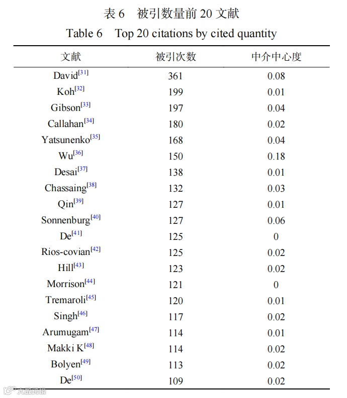 将被引频次前20的文献列为表6。本文在此分析被引次数前三的文献。其中,被引次数最多的是David于2014年发布在《Nature》上的一篇文章:Diet rapidly and reproducibly alters the human gut microbiome,这篇文章给予不同组别受试者以植物或动物为基础的饮食,通过对其的肠道微生物进行分析,得出饮食可以快速改变人体肠道微生物组的结论。可认为该论文在促进2014年后年发文量进入新阶段发挥了重要作用(图3),推动了该领域的发展。第二篇文章是Koh于2016年发布在《Cell》上的:From dietary fiber to host physiology: Short-chain fatty acids as key bacterial metabolites,这篇文章讨论了短链脂肪酸是如何合成、分布,以及如何在健康和疾病中发挥作用。第三篇文章是Gibson于2017年发布在《Nature Reviews Gastroenterology & Hepatology》上的:The international scientific association for probiotics and prebiotics (ISAPP) consensus statement on the definition and scope of prebiotics。这篇文章介绍了益生元的发展、益处和监管,并给出了益生元的新定义:能够被宿主选择性利用并有益于宿主健康的物质,此定义一直沿用至今。由表6可得被引数量前4的文章中有三篇发表年份为2016年或2017年,可以推测这与2018年后年发文量的激增有一定关系。