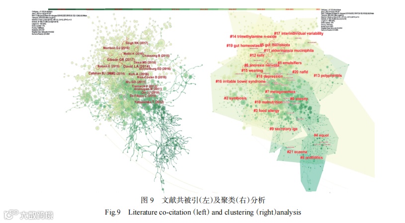 共被引文献指被同一篇文章引用的文献,文献的被引次数是衡量其学术影响的重要指标之一。图9(左)为CiteSpace绘制的食品与肠道微生物领域的文献共被引网络。图中共有1582篇被引文献构成关联节点,节点的大小和文献被引用次数的多少呈正相关,高被引文献通常被认为是里程碑,具有开创性的意义。每个节点都有树木年轮般的外环,不同颜色的外环代表不同的被引时间,外环的厚度和在该年份中的被引次数成正比,不同颜色外环所对应的年份和图谱上方年份相对应;不同节点之间的连线表示被同一篇文章引用;具有紫色(中介中心度高)的红色(突现性强)外环的文献和高被引频次的文献都是该领域内的重要文献。