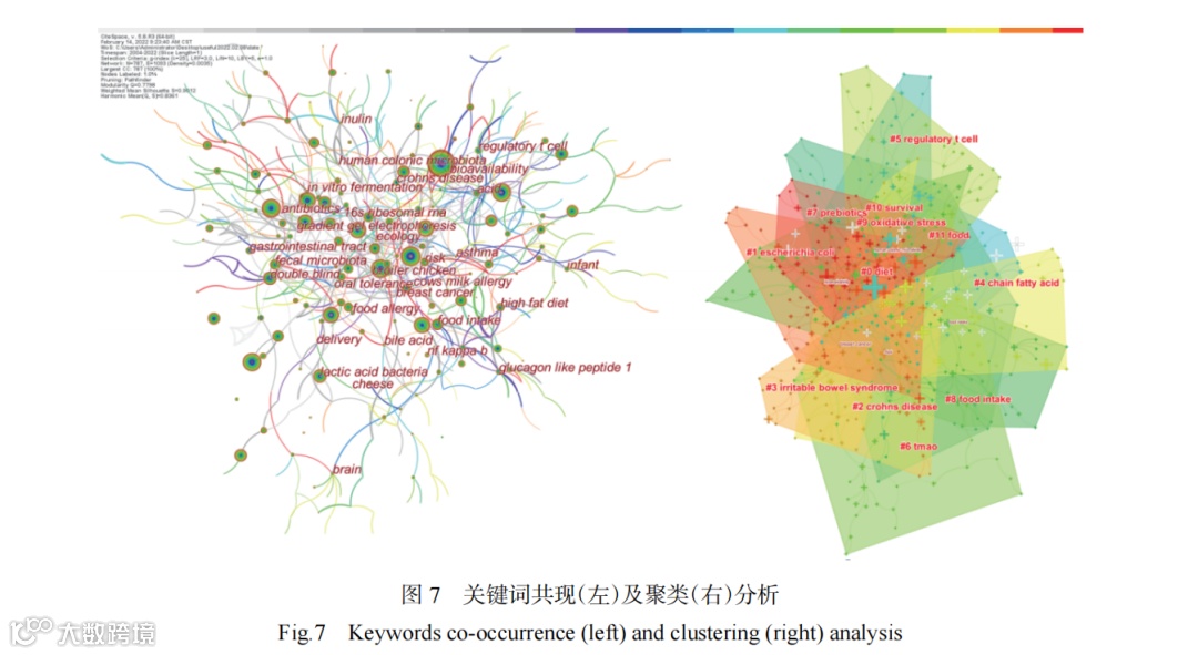 被引文献(图9左)为研究领域的知识基础,由知识基础聚类得领域的研究前沿(图9右)。聚类的Q值为0.8067>0.3,S值为0.9205>0.5,说明此聚类十分可信。所得22个聚类分别为#0肥胖、#1乳化剂、#2共生、#3食物过敏、#4马雌酚、#5肠道微生物、#6神经性厌食、#7宏基因组学、#8益生菌、#9分泌型IgA、#10营养不良、#11嗜黏蛋白阿克曼菌、#12开菲尔、#13多酚、#14氧化三甲氨、#15断乳、#16过敏性大肠综合征、#17个体差异、#18抑郁、#19肠道稳态、#20非酒精性脂肪性肝和#21湿疹。但研究领域有知识更新周期,聚类的时间线图可以分析聚类发展状况和目前的研究前沿。结果显示,每个聚类持续的时间不同,有的聚类持续了十几年现在仍处在活跃状态,像#2共生;有的集群仅仅持续了7、8年,像#4马雌粉。目前关注较多的研究前沿为#1乳化剂、#2共生、#5肠道微生物、#11嗜黏蛋白阿克曼菌和#12开菲尔。但这些聚类都处于发展的第三阶段,后续仍会有更有活力的研究前沿。