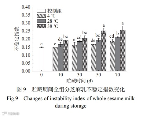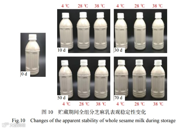 图9 的结果表明,与控制组相比,三种不同温度条件下贮藏的全组分芝麻乳产品不稳定指数都随着时间的延长而增大。这可能是因为贮藏过程中蛋白质 聚集成大颗粒形成沉淀,使得产品稳定性下降,从而导致产品不稳定指数增大。38 ℃ 贮藏条件下的产品不稳定指数的增大最为明显,这可能是因为高温贮藏会进一步加速蛋白质的聚集,从而降低产品的稳定性。但从图 10 可以看出,在三个不同温度下贮藏的全组分芝麻乳产品在 70 d 内均未出现沉淀分层现象,样品均一,保持良好的表观稳定性。以上结果表明,与控制组结果对比,随着贮藏时间的延长,产品的不稳定指数会逐渐增大,但变化程度不足以表现在产品外观上,产品仍能在较长的时间内保持良好的表观稳定性。