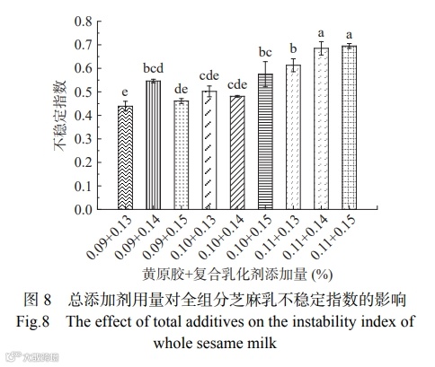 从图 8 的不稳定指数实验结果表明,黄原胶添加量为 0.09%,复合乳化剂(蔗糖酯:单甘酯=8:2)添加量为 0.13% 时的全组分芝麻乳样品不稳定指数最低,因此,确定此添加量为最优复配添加量,以此添加量进行全组分芝麻乳的制备。