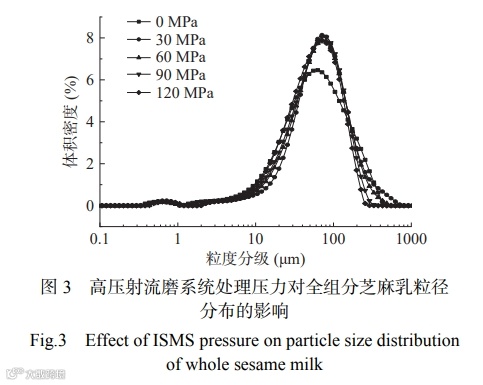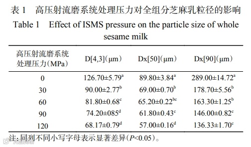 全组分芝麻乳体系的粒径决定了产品的口感润滑度, 从而直接影响消费者对产品的接受程度,通常粒径越大口感越粗糙。由表 1 可以看出,随着 ISMS 处理压力的增加,全组分芝麻乳样品的 D[4,3] 逐渐减小,处理压力为 120 MPa 时,D[4,3] 达到最小值为 68.17 μm。Dx[50] 与 Dx[90] 也呈现相同的变化规律。这可能是由于样品在微孔道中经历了强剪切、高速对流撞 击与空穴等作用力,使样品颗粒破碎,而增加 ISMS 的处理压力可以增强这些作用力,使样品粒径进一步减小。这也与 Guo 等关于不同压力 ISMS 处理对于全组分玉米汁粒径影响的研究结果相一致。从 图 3 中可以看出全组分芝麻乳的粒径分布图由两个峰组成,前面的小峰粒径分布范围在 0.1~1 μm,可能代表的是油脂单体,大粒径峰可能由脂肪和蛋白质等颗粒聚集体以及纤维组成。在 ISMS 处理压力为 30~120 MPa 范围内,随着处理压力的增大,大粒径峰逐渐向左偏移,且峰型逐渐变窄。这说明ISMS 处理压力的增加,有利于粉碎细化全组分芝麻乳大颗粒的粒径,降低样品的平均粒径;同时也会使粒径大小更加均一,从而改善样品口感润滑度,提高样品稳定性。