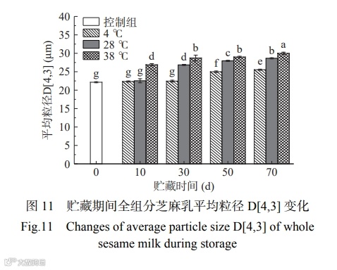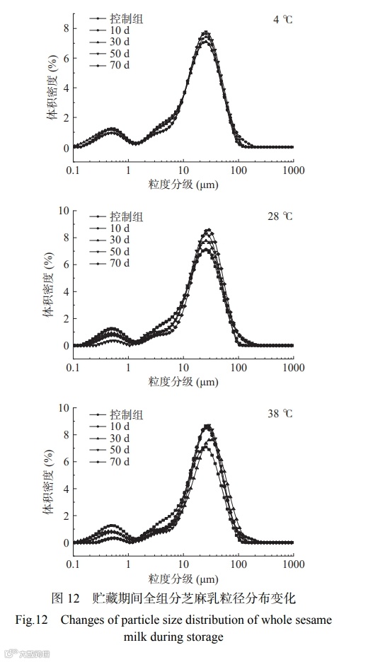 图 11 显示,在贮藏期内,三个不同温度条件下的全组分芝麻乳产品平均粒径 D[4,3] 均持续增大,由第 0 d 的 22.15 μm 分别增至第 70 d 的 25.55、28.65 和 30.00 μm。该结果与不稳定指数的变化规律相一致,说明粒径的增大可能是导致样品不稳定指数增加的原因之一,这也进一步验证了不稳定指数的结论。图 12 表明,产品在 4 ℃ 贮藏期间,粒径分布在 10~ 300 μm 范围内的峰随着时间延长而向右平移,这可能是由于在贮藏过程中产品中的脂肪及蛋白质等成分聚集形成大颗粒。而在 28 和 38 ℃ 条件下贮藏的产品的粒径分布除了在 10~300 μm 范围内的峰向右平移外,相比较控制组,基本上还都出现了 0.1~ 10 μm 处的峰面积减小的现象,这可能是由于高温贮藏加速了产品蛋白质和脂肪的聚集,从而使得原来在 0.1~10 μm 峰处的脂肪和蛋白减少。