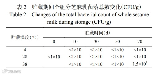 表 2 为使用 UHT无菌灌装后,全组分芝麻乳产品在三种不同贮藏温度下在贮藏期间菌落总数的情况。根据 NY/T 433-2021 规定,产品中的菌落总数须≤1×102 CFU/g。如表 2 所示,产品在 4、28 ℃ 条件下贮藏 70 d,均低于农业部行业标准上限,产品仍具有食用价值。而 38 ℃的产品贮藏至 70 d 时,其菌落总数已达 1.5×103 CFU/g, 超出行业标准上限,说明高温贮藏会加速微生物的生长繁殖,导致产品变质。