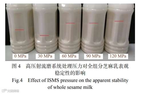 从图 4 中可以看出,经过不同压力处理的全组分芝麻乳样品在 4 ℃ 下静置 1 d 后均出现分层, 这可能是由于蛋白絮凝沉淀和油脂上浮所导致的乳析现象。其中,在 30 MPa 下处理的样品乳析现象最为明显,这可能是因为处理压力较低时泵流量太小,截留在筛网中的不溶性固形物过多导致沉淀变少,使得乳析现象更为明显。在 60~120 MPa 的压力范围内,随着 ISMS 处理压力的增加,乳析现象逐渐减小,稳定性逐渐提高,120 MPa 下处理的样品乳析现象最小。这也与粒径的结果相符合。