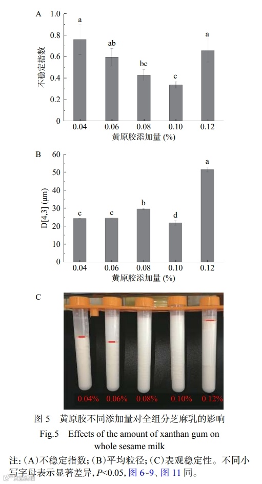 图 5(A)结果表明,全组分芝麻乳样品的不稳定指数随着黄原胶添加量的增加呈现先降后增的趋势,且当黄原胶添加量为 0.10% 时其不稳定指数最低。由图 5(C)可以看出,表观稳定性实验也表现出相同的结果,黄原胶添加量为 0.08% 和 0.10% 时样品无分层现象,这可能是因为黄原胶形成的网状结构改善了乳液的稳定性。而当黄原胶添加量增加到 0.12% 时, 全组分芝麻乳又出现少量的分层现象,可能是因为黄原胶添加过量时,黄原胶在溶液中会发生凝聚,从而使得体系出现分层现象。以上结果说明添加适量黄原胶能有效提高全组分芝麻乳的稳定性,这也与Saharudin 等的研究结果一致。
