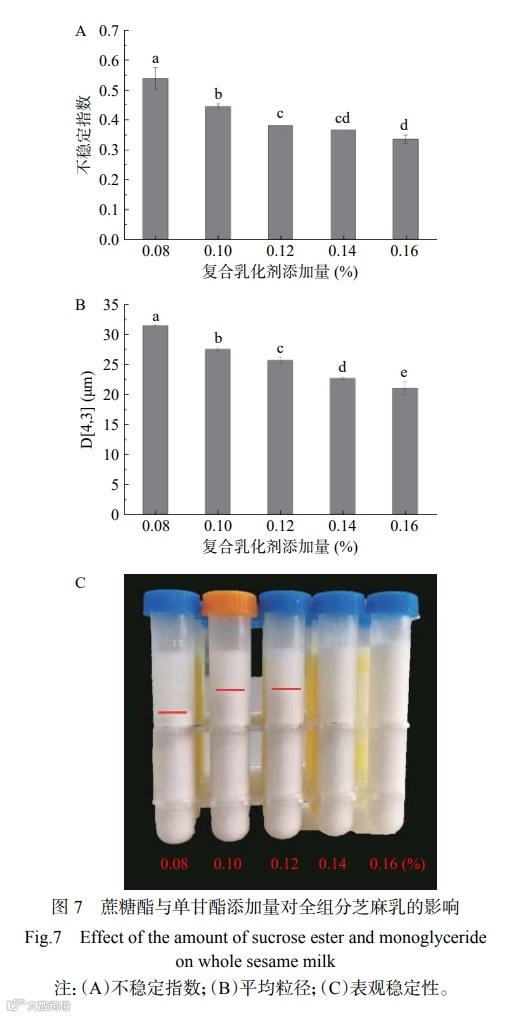 图 7(A)和图 7(C)结果显示,随着复合乳化剂(蔗糖酯:单甘酯)添加量的增加,全组分芝麻乳样品的不稳定指数逐渐降低,其分层现象也逐渐改善。其中,0.12%~0.16% 的不稳定指数无明显变化,且添加量达到 0.14% 和 0.16% 时的样品已无分层现象。这可能是因为随着稳定剂用量的增加,乳化剂在界面上与蛋白质竞争吸附的能力增强,降低界面张力的作用也随之增强,使得脂肪球聚结的几率降低,从而使得样品稳定性提高。而当乳化剂的浓度达到临界胶束浓度后,再增大乳化剂用量对全组分芝麻乳稳定性的影响不大;而且乳化剂分子可能会在溶液内部聚集,构成亲油基向内、亲水基向外的球状胶束,甚至可能降低其乳化效果。