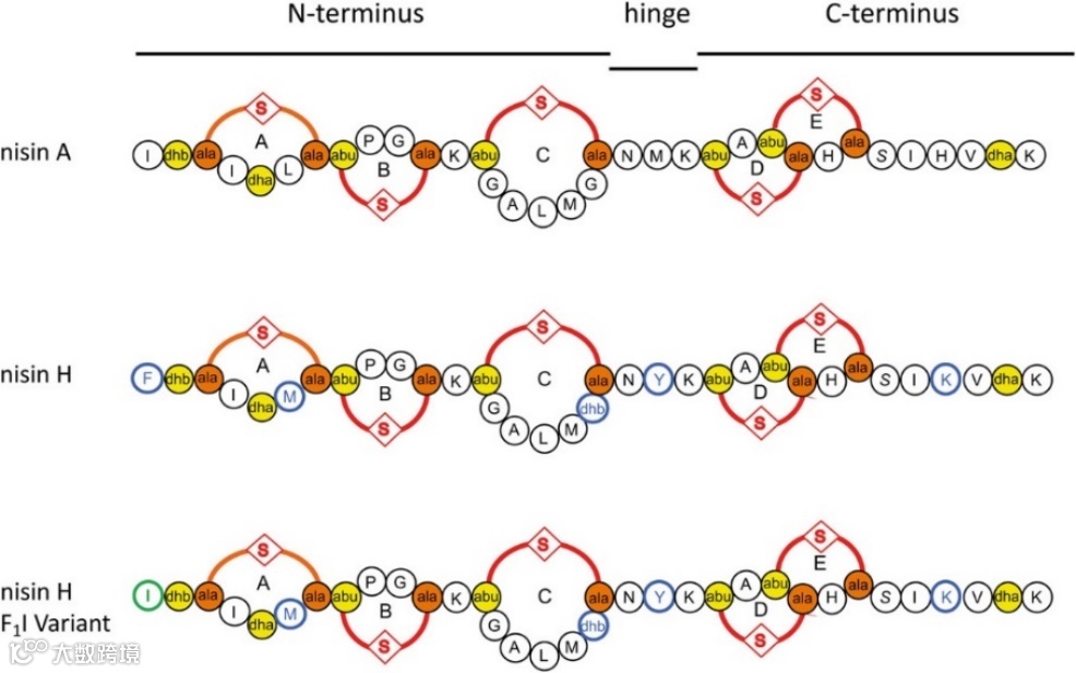 图4 硫醚抗生素乳链菌肽A,乳链菌肽H和乳链菌肽H F1I的结构示意图。蓝色突出显示乳链菌肽H和乳链菌肽H F1I与乳链菌肽A相比的点突变。黄色和橙色标记用于鉴定有助于(甲基)-羊毛硫氨酸环合成的半胱氨酸残基和脱水氨基酸(环A,B,C),D和E)。乳链菌肽H F1I变体的突变以绿色突出显示。经许可,从参考文献 [1]转载,©2020。