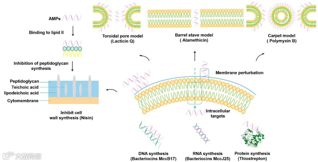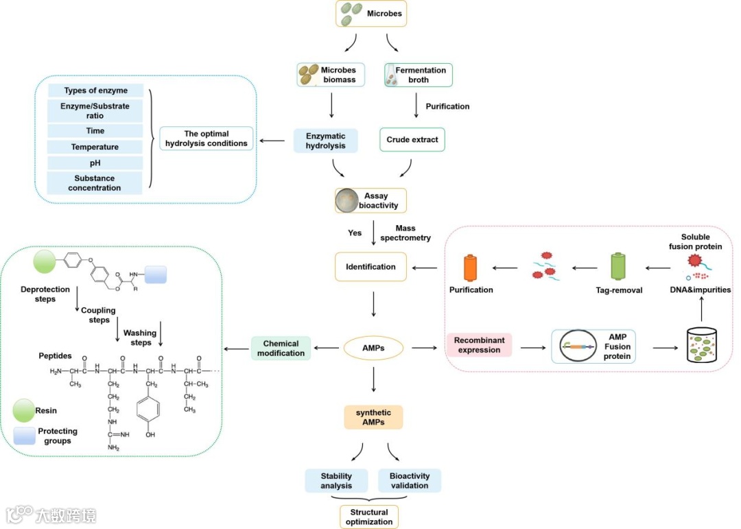 图1. 微生物中天然存在的AMPs。生产者主要来自土壤,海洋,动物,植物和人类微生物,包括细菌,真菌和微藻。