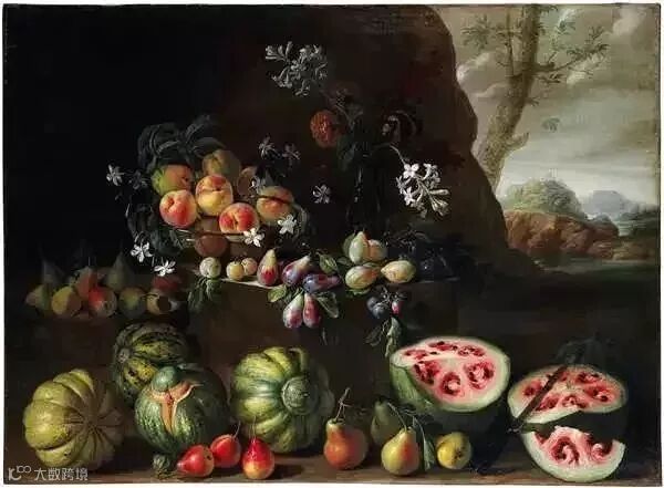 这是一幅17世纪意大利画家吉奥瓦尼·斯坦基(Giovanni Stanchi)的绘画作品,右下角的植物应该比较好辨认喽?没错,它就是野生西瓜!这幅画很好地展现了当时西瓜内部种子的样子!