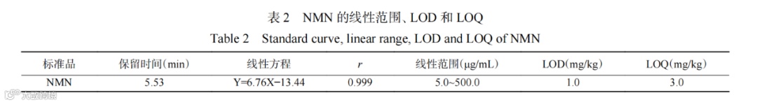 以方法中的色谱分析条件对NMN标准工作溶液进行测定,通过iChrom5100 workstation绘制标准曲线回归方程,其线性范围、相关系数、LOD及LOQ如表2所示。