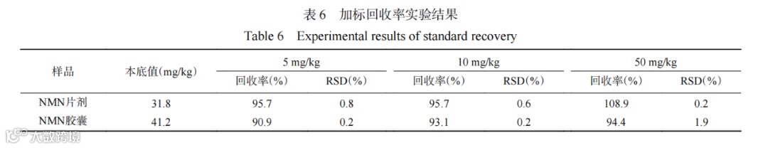 由表6数据可知,NMN片剂和NMN胶囊样品中NMN的检测回收率在90.9%~108.9%之间,相对标准偏差均不超过1.9%,表明本方法回收率好,结果准确可靠,本方法可用于实际样品中NMN含量的准确测定。