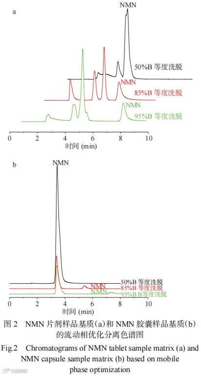 为尽可能地将待测的NMN与胶囊和片剂样品基质中其他成分分离开,首先对流动相溶液配比进行了优化。用50%甲醇水溶液作为提取液溶解胶囊和片剂样品配制成待测液,分别以95% B、85% B、50% B(V/V)的等度分离方式对NMN胶囊和片剂样品进行色谱分离,通过单标法对峰的归属进行了确证,由此判断检测时最佳的流动相比例。分离谱图如图2所示,其中图2a为NMN片剂样品的分离谱图,图2b为NMN胶囊的样品分离谱图。从图中可以看出,随着流动相中甲醇含量的增大,NMN的出峰时间逐渐后移。对于片剂样品以50%比例等度洗脱时,NMN与基质无法得到有效分离,而使用95% B比例等度洗脱时NMN的出峰时间较晚,影响分析方法的效率,而且也伴随着峰展宽。当使用85% B比例等度洗脱时分离效果最好,NMN的出峰时间较短,峰形也基本满足高斯分布,可以达到基质中杂质峰与被分析物色谱峰分离的效果,降低了杂质峰干扰的可能,从而省去对提取液进行净化处理的步骤,可以将分析方法的总体时间控制在8 min内完成,使得操作简便、耗时较短,提高了分析检测效率。对于基质较为简单的胶囊样品,可以看出同样使用85% B比例等度洗脱,具有最好的分离效果、峰形和分析效率。所以采用85% B比例等度洗脱进行后续实验。