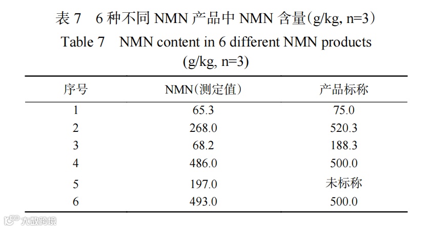 按照本文发展的NMN片剂和NMN胶囊剂样品基质中NMN含量的检测方法对市售6个品牌的NMN产品中的NMN含量进行分析测试,检测结果见表7。