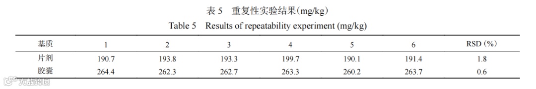 由表4数据可知,对于NMN片剂和NMN胶囊,6次测定结果RSD均较小,说明结果都保持高度一致,可以保证方法的稳定性。