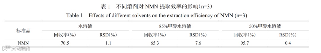 根据NMN的理化性质,NMN在水中溶解度较大,在甲醇中溶解度较小,在仪器及实验条件相同情况下,本实验选择了水溶液、50%甲醇水溶液、85%甲醇水溶液3种溶剂开展样品提取溶剂优化实验。由于NMN在甲醇中几乎不溶,故不选择用纯甲醇作为提取溶剂。取0.5 g粉碎后的片剂和胶囊样品,向其中各添加一定量的NMN标准储备液,使加标浓度为10 μg/mL,采用方法中的样品提取方式,分别以上述3种溶剂进行提取,并测定加标回收率,结果如表1所示。从表1中可以看出,以50%甲醇水溶液作为提取溶剂,样品的回收率可控制在90%~110%之间,同时偏差最小,具有最佳的提取效果。因此,在后续实验中采用50%甲醇水提取溶剂进行提取。