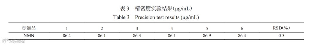 按照方法中实验步骤,对浓度为90 μg/mL的NMN标准溶液进行6次平行测定,将测得的NMN的响应值带入线性方程计算得到溶液中NMN的含量,并计算6次测定结果的RSD如表3所示。
