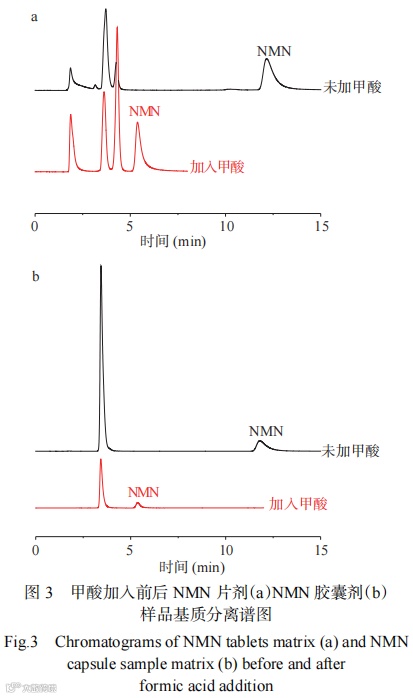 综上,对于NMN片剂和NMN胶囊基质,采用添加甲酸的方式能够改善NMN峰形,因此以0.1%甲酸水溶液-0.1%甲酸甲醇溶液(15:85,V/V)为流动相进行分离。