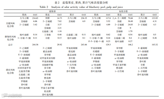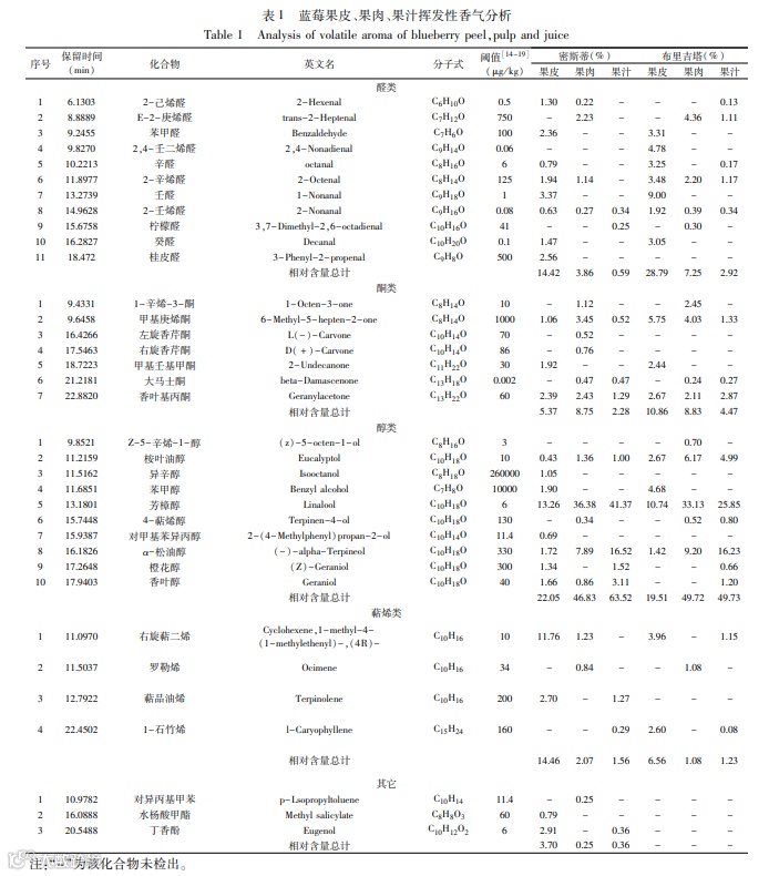 气味活度值法评价蓝莓果皮、果肉、果汁挥发性香气成分