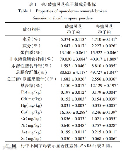 目的:灵芝孢子粉是灵芝在其子实体发育成熟后,不断从菌管中弹射出孢子汇集而成。其含有丰富的生物活性成分,具有很高的食药用价值。但由于灵芝孢子粉具有坚硬的孢子壁,孢子内的有效物质很难通过孢子壁溶出而被人类吸收利用。因此,为明确灵芝孢子粉的物质基础,本研究以去壁灵芝孢子粉与破壁灵芝孢子粉为原料,探究不同孢子壁加工工艺对灵芝孢子粉化学成分及抗氧化活性的影响,为开展灵芝孢子粉相关功能活性的研究提供理论基础。