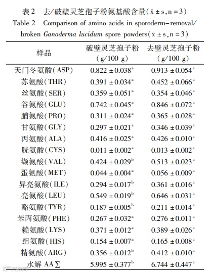 Methods:In this experiment, water, ash, dietary fiber, protein, total triterpenoids, total polysaccharides, trace elements, amino acids and other main indexes as well as the antioxidant activities in vitro such as total reducing power, scavenging ability of DPPH radical (DPPH·), scavenging ability of ABTS+ radical (ABTS+·), scavenging ability of hydroxyl radical (·OH) were compared between the sporoderm-removal Ganoderma lucidum spore powder and sporoderm-broken Ganoderma lucidum spore powder.