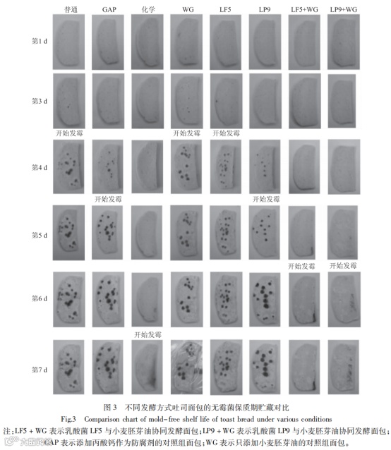 本文通过初筛和复筛考察不同乳酸菌的抗真菌活性,并将小麦胚芽油添加入乳酸菌培养液中进行发酵,旨在 明确乳酸菌协同小麦胚芽油发酵对抗黑曲霉活性的影响。研究表明,小麦胚芽油不具有抑制黑曲霉生长的能力,而乳杆菌LF5发酵液抑菌率随着小麦胚芽油浓度的升高明显提升,且该现象具有菌株特异性。通过加热、中和pH、添加蛋白酶及过氧化氢酶发现,乳酸菌协同发酵上清液中的抗真菌活性物质主要由有机酸以及部分具有良好热稳定性的非蛋白类组分组成。此外 ,采用乳杆菌LF5协同小麦胚芽油发酵制备面包,在第5 d发现肉眼可见霉菌,与空白组(第2~3 d)相较具有显著抑制黑曲霉生长活性的作用,为乳酸菌在发酵米面食品中的应用提供了新的方向。