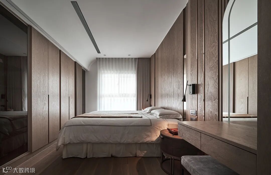主卧灵活回避了梁压床,更于在天花板划出一道圆弧收角,将梁藏于无形,木质床头墙则于对侧展开,眼看流弧缓缓包裹。