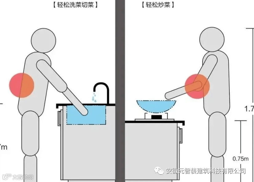 在生活使用厨房中,在清洗盆洗菜、洗碗,处理食材的时候,如果水槽台面太低就需要弯着腰洗。在灶台炒菜的时候,如果灶台太高,那在烹饪菜肴的时候就架着手,弯着腰,做一顿饭菜,还让人感觉腰酸背痛的感觉。