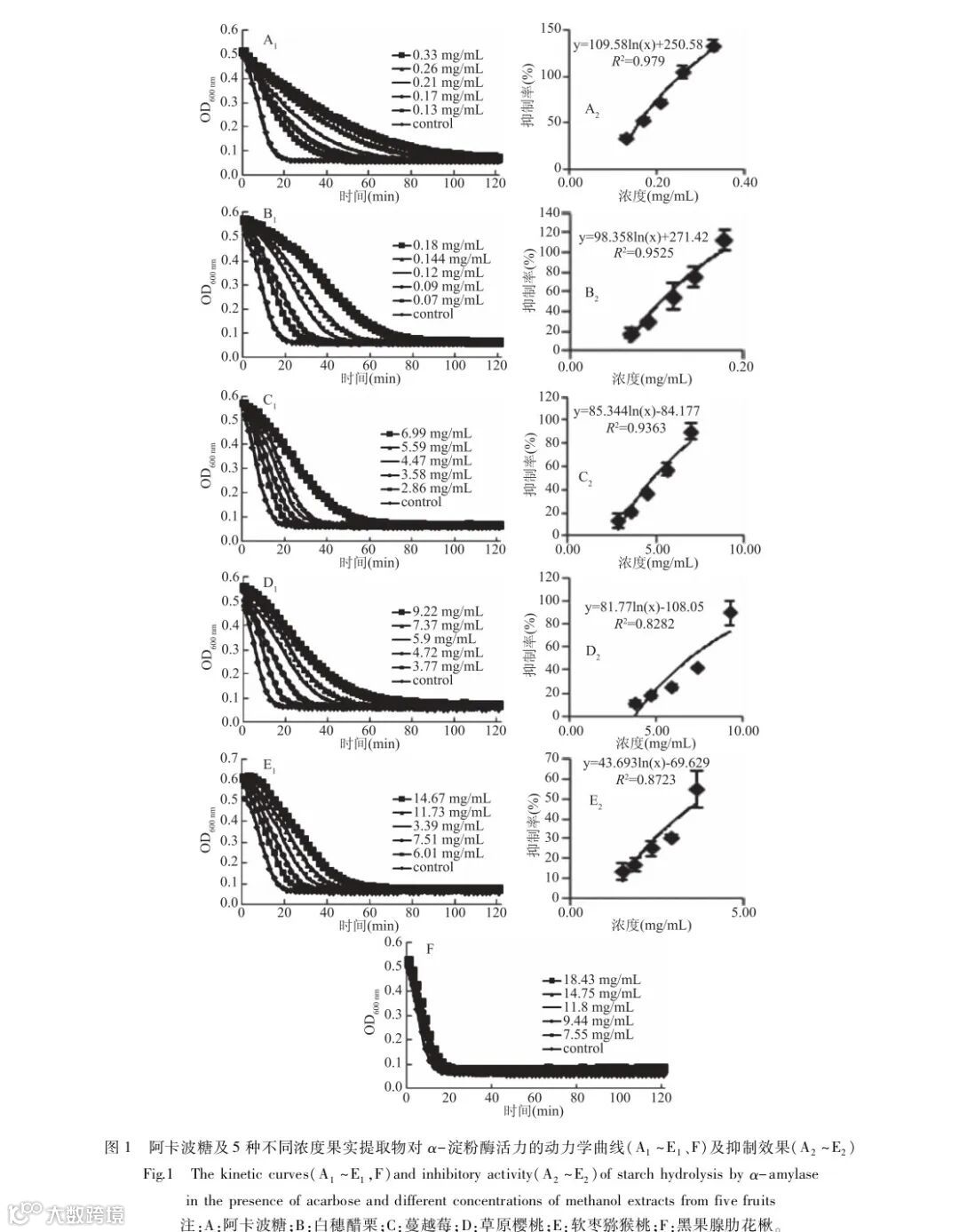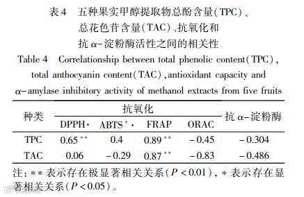 Methods:Firstly, freeze dry and grind the collected five types of fruits, including kiwiberry, black chokeberry, sour cherry, white currant and cranberry, and used 80% methanol as the extraction solvent to obtain polyphenol extracts from the five types of fruits. Secondly, the polyphenol content and total anthocyanin content of the five fruit polyphenol extracts were measured using the Folin phenol method and pH differential method, respectively. The antioxidant activity was evaluated using four methods: DPPH• method, ABTS+• method, ferric ion reducing antioxidant power (FRAP), and oxygen radical absorption capacity (ORAC). The effects of five polyphenol extracts on α-amylase inhibitory activity were also studied. Finally, the correlationship of total phenolic content (TPC), total anthocyanin content (TAC), antioxidant activity and α-amylase inhibitory activity were analyzed.