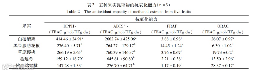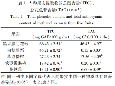 方法:首先,将采集到的软枣猕猴桃、黑果腺肋花楸、草原樱桃、白穗醋栗和蔓越莓五种果实冻干后磨粉,并以80%甲醇做提取溶剂获取五种果实的多酚提取液。其次,通过福林酚法及pH示差法分别测定以上五种果实多酚提取液的多酚含量与总花色苷含量;以DPPH法、ABTS+法、铁离子还原法(Ferric ion reducing antioxidant power,FRAP)、氧自由基吸收能力(Oxygen radical absorbance capacity,ORAC)四种方法测评其抗氧化活性,并研究了五种多酚提取液对α-淀粉酶活性的抑制作用。最后,对五种果实中总酚含量(Total phenol content,TPC)、总花色苷含量(Total anthocyanin content,TAC)、抗氧化活性和抗α-淀粉酶活性之间的相关性进行分析。