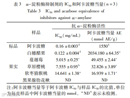 Results:There were significant differences in the total phenolic and total anthocyanin contents among the five cold region fruits (P<0.05). The total phenol content ranges from 13.21 to 66.43mg GAE/100 g, with the highest content in black chokeberry and followed by white currant. The total anthocyanin content was 0.15~46.45 mg C3G/100 g, with the highest content in black chokeberry, followed by sour cherry. The antioxidant capacity of the five fruits also varies. The scavenging ability of fruit polyphenols on DPPH• and ABTS+•, from strong to weak, was as follows: white currant>black chokeberry>sour cherry>cranberry>kiwiberry. White currant fruit polyphenols had the strongest ability to inhibit DPPH• and ABTS+•, with 414.46, respectively μmol TEg-1 and 2662.74 μmol TEg-1, significantly higher than other fruits (P<0.05). The order of fruit polyphenols' ability to reduce iron ions (FRAP) from strong to weak was as follows: black chokeberry>kiwiberry>white currant>sour cherry>cranberry. The antioxidant capacity measured by ORAC method, from strong to weak, was as follows: kiwiberry>white currant>sour cherry>cranberry>black chokeberry. Determination of white currant using high-throughput starch turbidity method on α-amylase inhibitory activity was the strongest, with an IC50 of 0.122 mg/mL, higher than acarbose (0.16 mg/mL), and an AE value of 2034.18 mmol AE/g, higher than acarbose (1550 mmoL AE/g), which was 42~127 times higher than other fruits. Correlation analysis found that there was a highly significant positive correlation (P<0.01) between the total phenolic and anthocyanin contents, as well as antioxidant activity, of the five cold region fruits, and no significant correlation with α-amylase inhibitory activity.