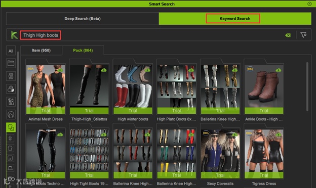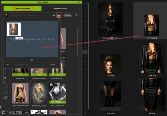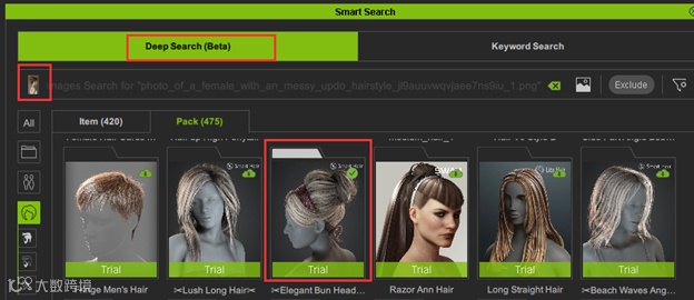 现在,想象一下使用人工智能创建一个独特的角色设计。通过将参考图片上传到深度搜索,您可以立即找到与您的设想相匹配的发型、服装和配饰。另外,如果您有特定的物品,只需简单的关键字描述,就能找到所需的确切资产,而无需无休止地滚动。