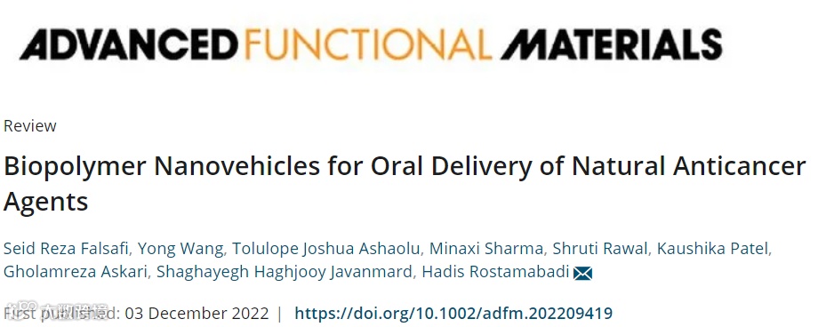 2022年12月3日,伊朗伊斯法罕医科大学营养与食品安全研究中心Hadis Rostamabadi课题组在国际期刊Advanced Functional Materials (Q1,IF:19.924)(点击查询最新即时IF和分区)发表题为“Biopolymer Nanovehicles for Oral Delivery of Natural Anticancer Agents”的综述性论文。
