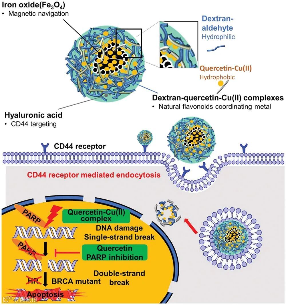 图2 示意图展示了CD44靶向载体的制备和机制,以共同递送槲皮素(作为PARP抑制剂)和铜(II)-槲皮素(作为DNA破坏剂)来治疗BRCA突变的TNBC。