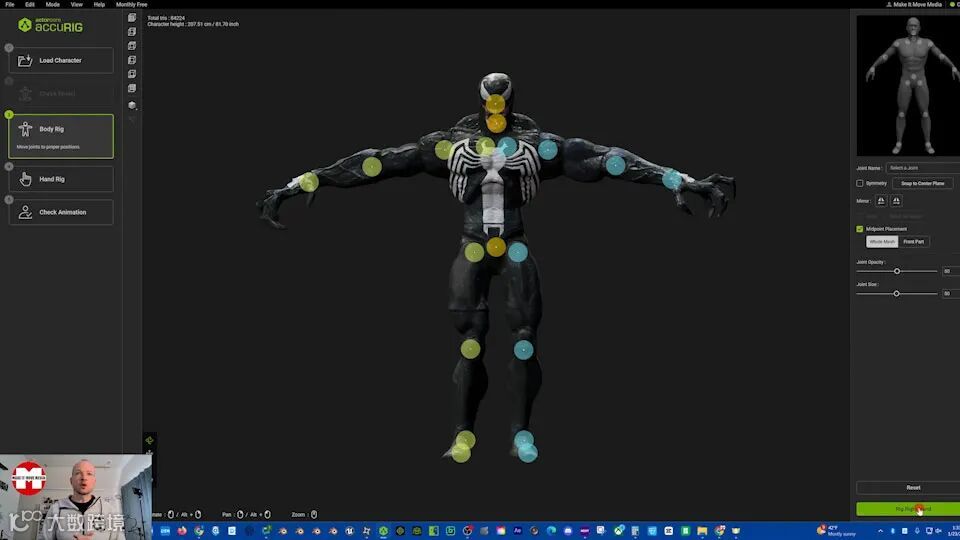 手动放置肘部、膝盖和颈部的点。AccuRIG根据这些点添加骨骼。