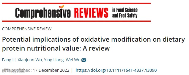 2022年12月17日,中南林业科技大学吴伟教授团队李芳博士在食品领域国际顶级期刊Comprehensive Reviews in Food Science and Food Safety(Q1, IF=15.786)(点击查询最新即时IF和分区)在线发表题为“Potential implications of oxidative modification on dietary protein nutritional value: A review”的综述性论文(点击查看该刊投稿指南)。