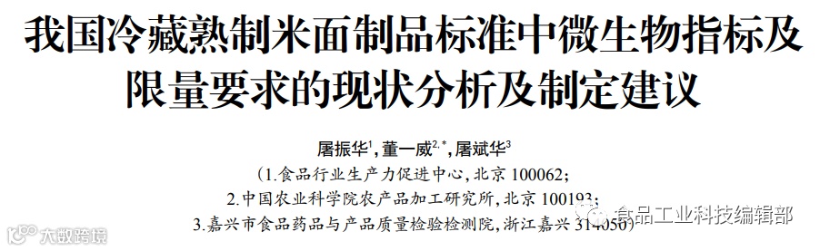食品行业生产力促进中心屠振华,中国农业科学院农产品加工研究所董一威*等聚焦微生物风险较高且标准尚属于空白的冷藏熟制米面制品,在分析我国主要冷藏熟制米面制品标准微生物指标现状的基础上,分析研究国外标准和法规对冷藏熟制米面制品中微生物限量规定现状,并提出标准制定的相关建议,为我国制定冷藏熟制米面制品行业标准等相关标准提供确定微生物种类及限量等技术依据。
